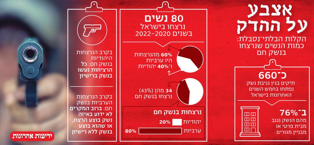 بحسب معطيات قسم الشرطة والجرائم وضحايا الأسرة، فقد قُتلت 80 امرأة في كيان العدو خلال الأعوام 2020-2022 - 34 منهن (43%) بأسلحة نارية.