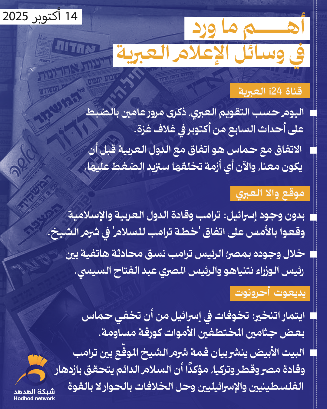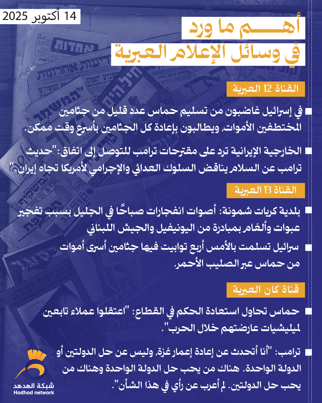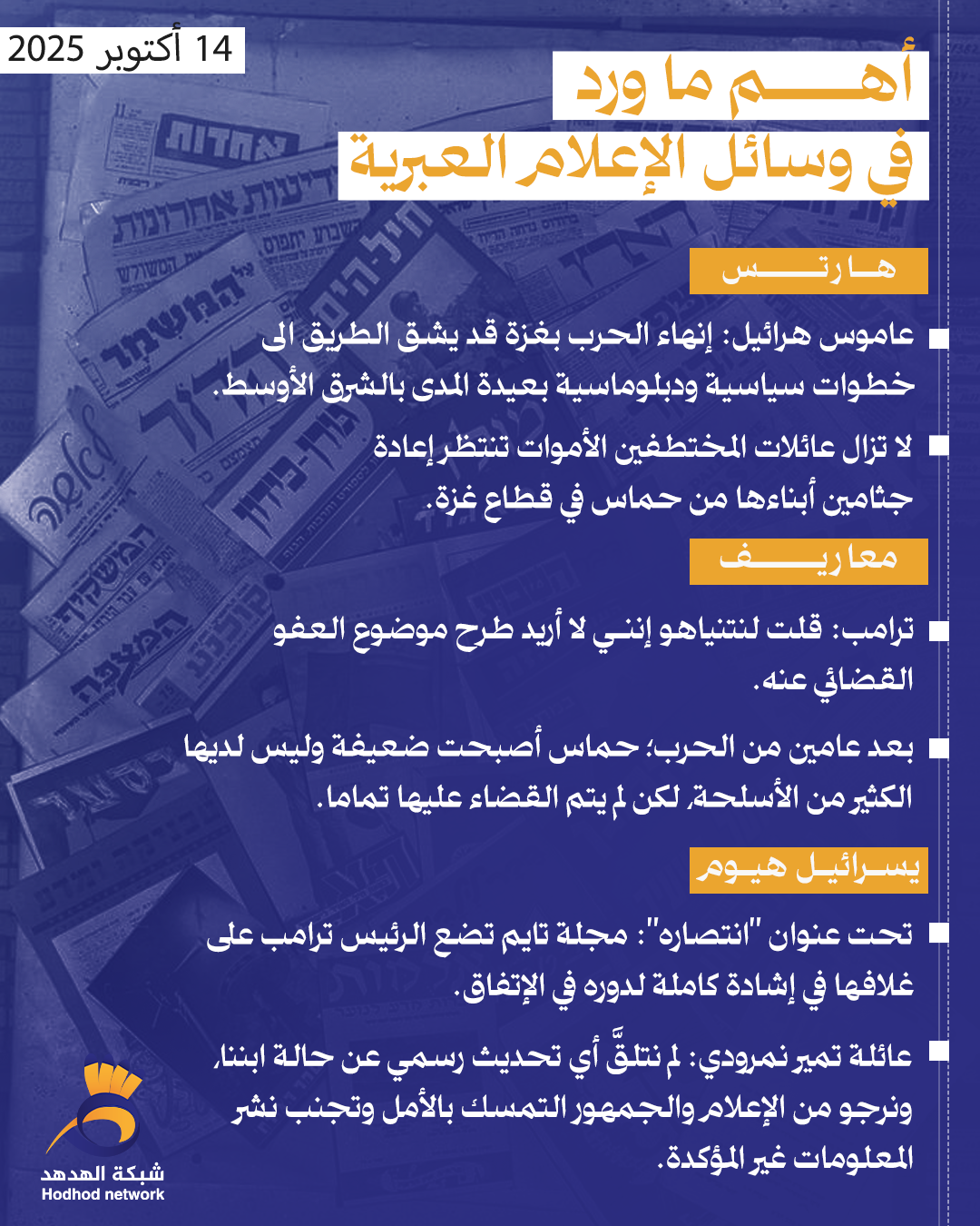 أبرز العناوين بوسائل الإعلام العبرية صباح اليوم 14/ أكتوبر /2025 أخبار رئيسية 14 أكتوبر 2025 كلمات دلالية قراءات الصحف الإعلام العبري